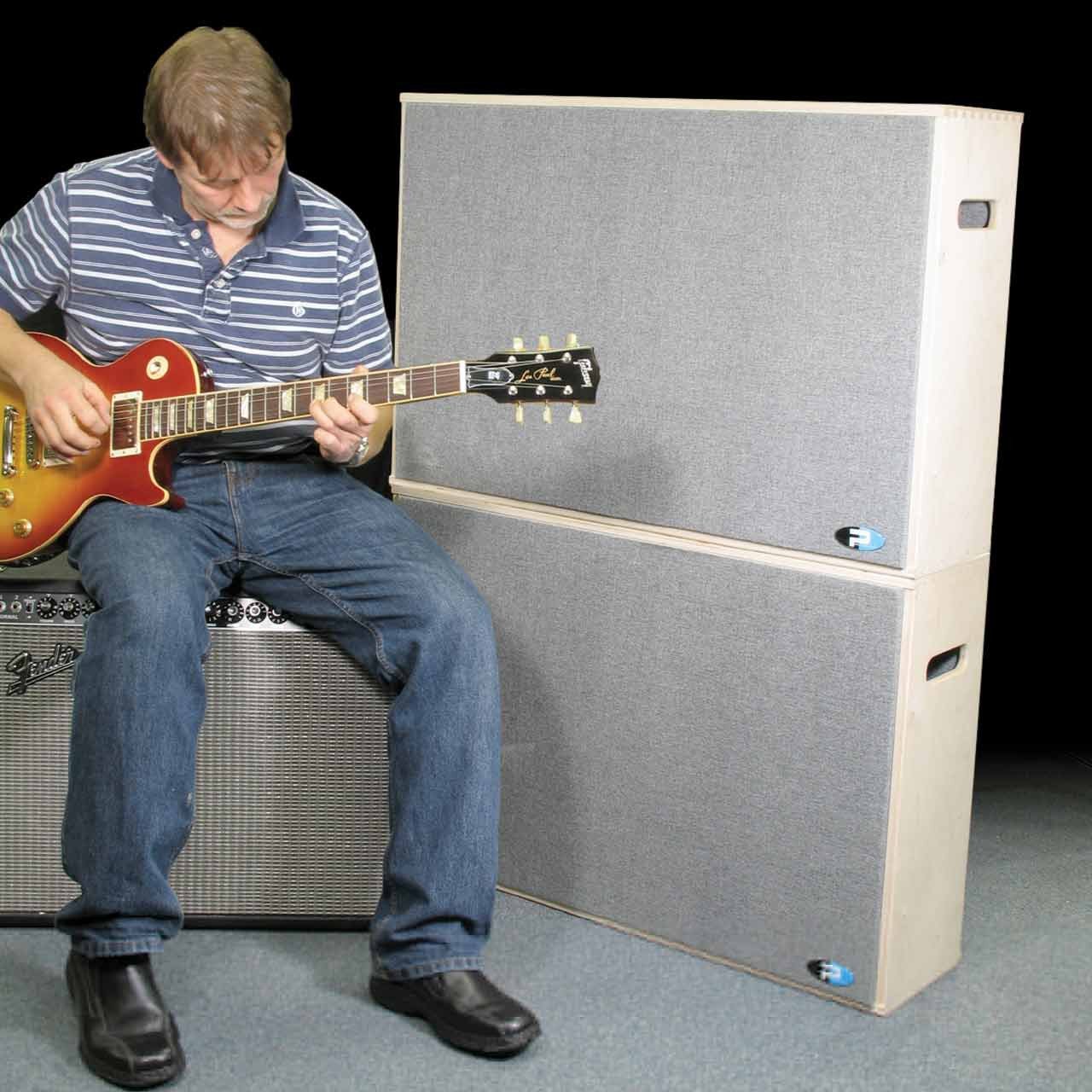It features two Broadway fabric covered high-density glass wool acoustic panels mounted on both sides that effectively absorb the sound. This is augmented with a heavy internal MDF board that adds mass to help contain spill between instruments. The MDF board also acts like a low frequency resonator that combines with the acoustic panels and the deep internal air cavity to absorb bass down to 75Hz.