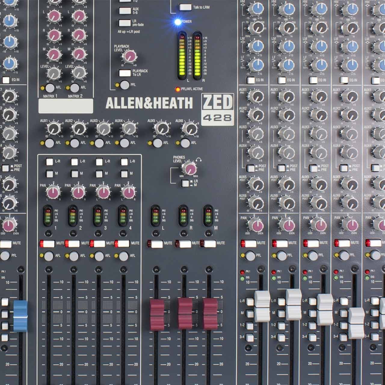 The middle-man of the Allen & Heath "4-bus" ZED series, the ZED-428 features 24 mic/line channel strips. Outputs, monitoring, aux section and sub-groups are identical to the ZED-420 and ZED-436. All three consoles are an excellent option for live audio and studio recording - featuring direct outs, insert points and independent phantom power on every mono input too! ZED-428 is excellent for bands, houses of worship, theatres or AV applications. It has a truly professional feature set, which will fit any sound reinforcement application and professional PA hire stock. ZED-428 has Configurable USB audio in/out makes it easy to capture stereo recordings, 24 mic or line inputs plus 2 dual stereo inputs, 4-band EQ with MusiQ, 4 sub-groups, 6 auxiliary sends and a 7×2 matrix.