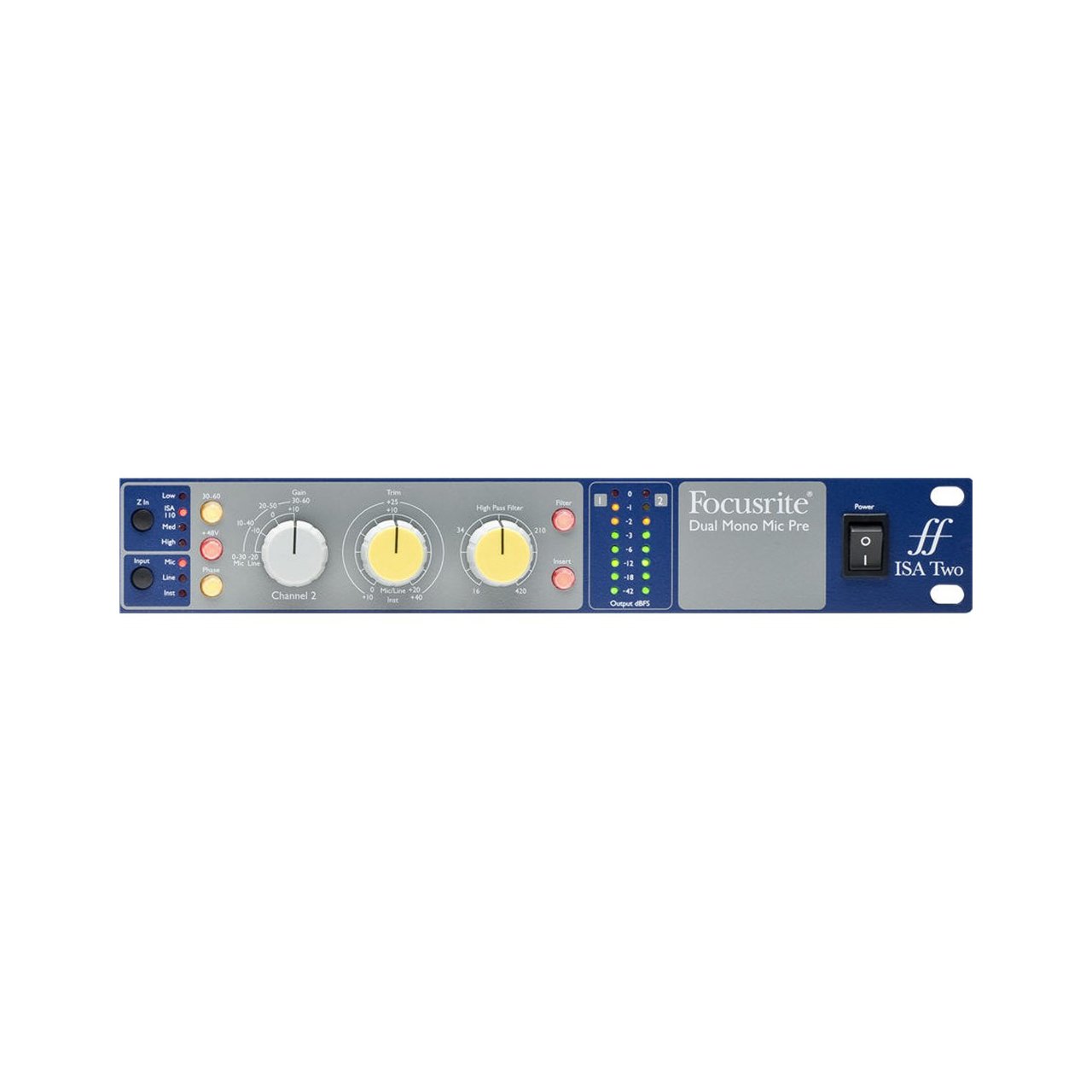 The Focusrite ISA Two is a high-end dual channel mic-pre. ISA preamps are based on the legendary Rupert Neve built pre-amp’s commissioned by Sir George Martin for the console at AIR Montserrat. At the heart of the ISA preamp is the input transformer - the Lundahl LL1538. The ISA Two also has variable impedance settings, instrument inputs, high pass filter, gain and trim encoders along with insert points too.