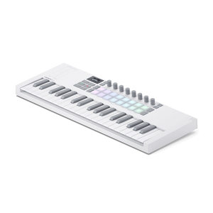 Launchkey Mini 37 White brings a sleek, modern look to a compact but powerful DAW controller. It features 37 white and grey mini-keys, eight encoders, and 16 velocity-sensitive pads for drums, instruments, and clip launching. Plus, Chord and Scale modes work with the OLED display to keep you in key.