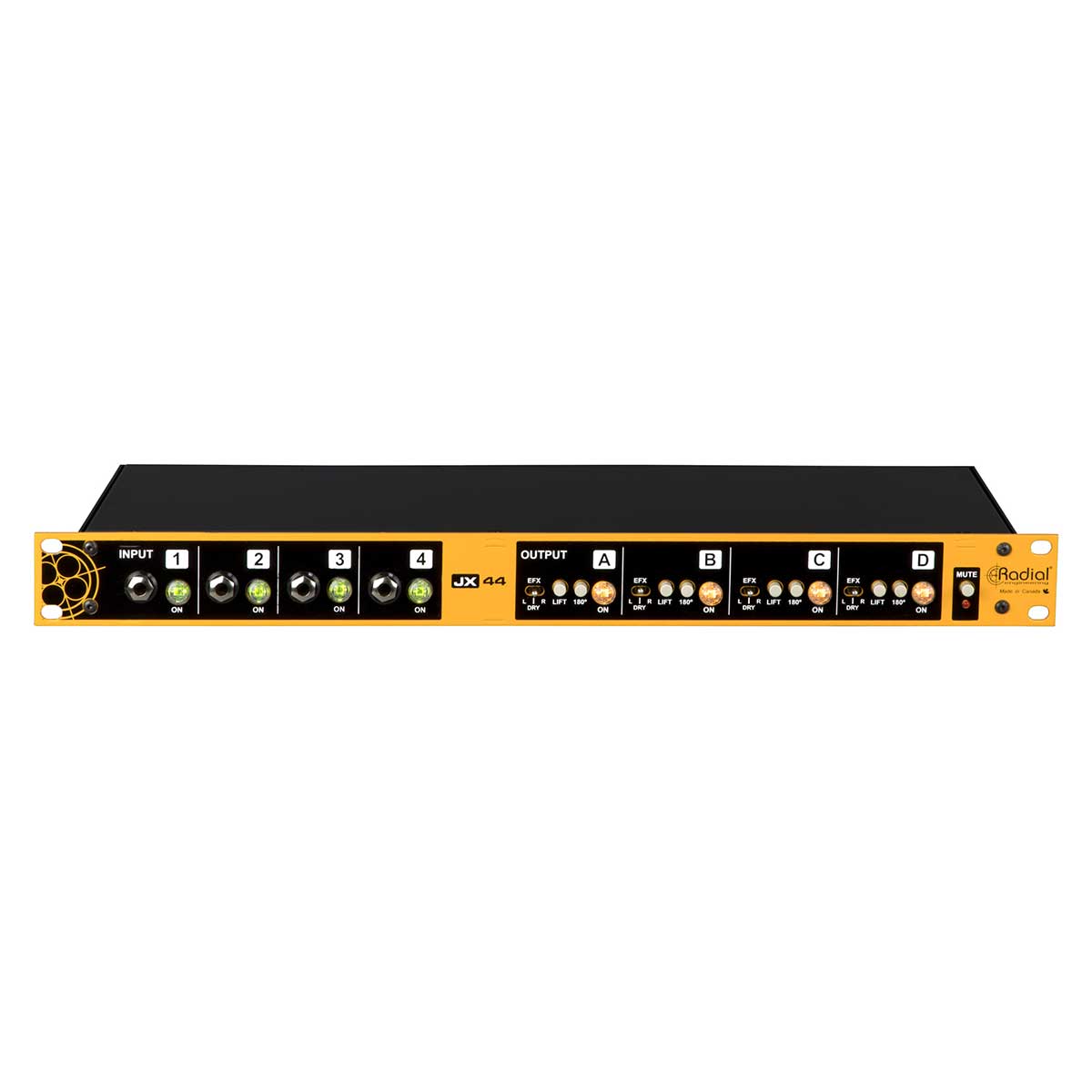 Four unbalanced outputs are all isolated with premium Jensen transformers for optimal tone and signal quality, with ground lift and 180 polarity reverse switches, ensuring multi-amp setups playback without phase issues or ground loop noise including hum and buzz. Gold-contact connectors are used throughout, with Radial’s trusted build quality to survive any touring conditions with ease. A Radial DI box output is also included for when a direct feed from acoustic instruments to FOH is required, also Jensen-equipped. For use on world touring acts, the JX44 V2 features an internal 120/240V switching power supply with an IEC cable that can easily be swapped out when travelling internationally.
