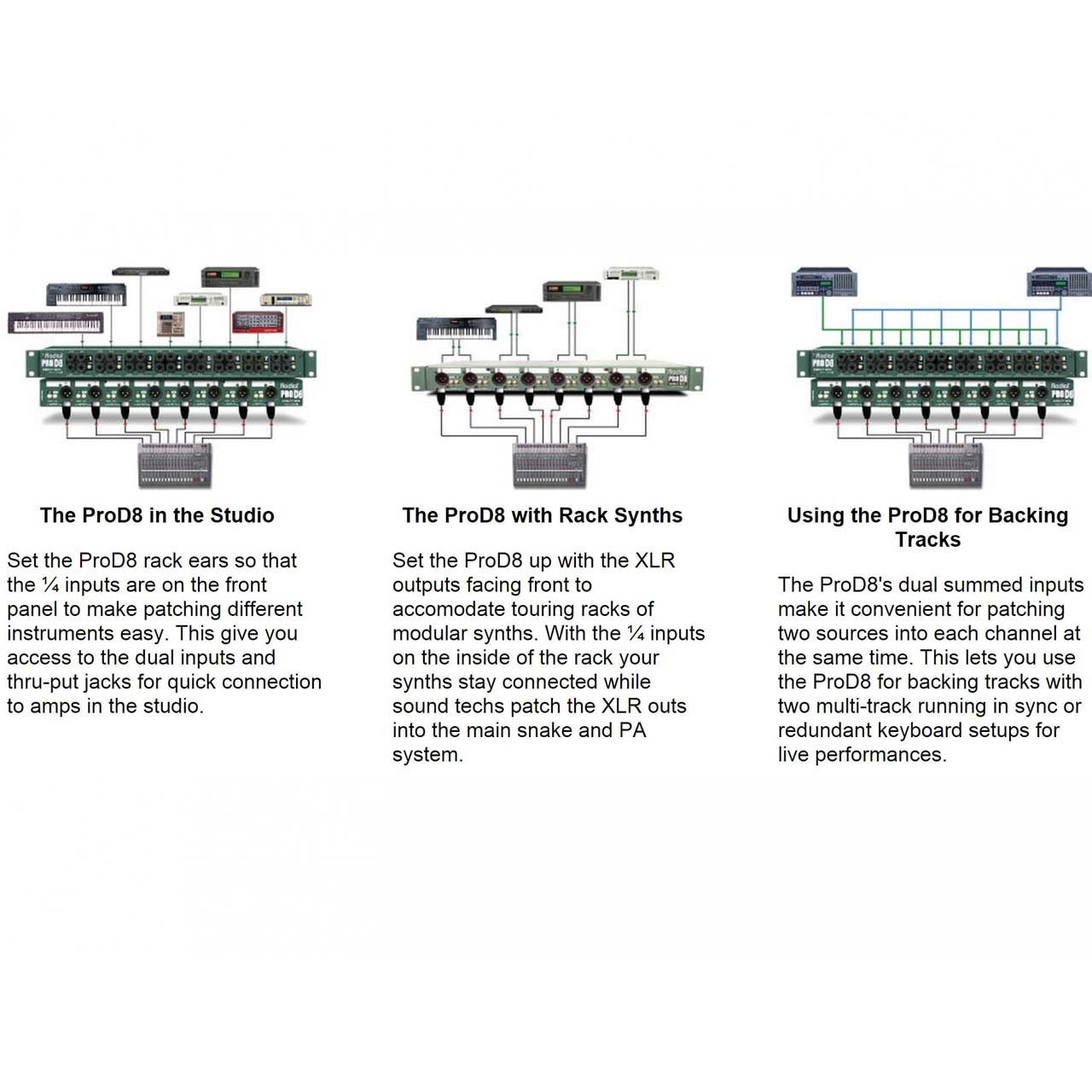 The output panel features isolated XLRs each equipped with ground lift and 180º polarity reverse. Internal switches may be routed to accommodate various schemes such as star grounding. To enhance setup options, the Radial ProD8 is equipped with reversible rack ears. This handy feature allows the system tech to position the inputs on the front of the rack when interfacing with external keyboards or have them inside if the setup is predominantly equipped with rack modules.