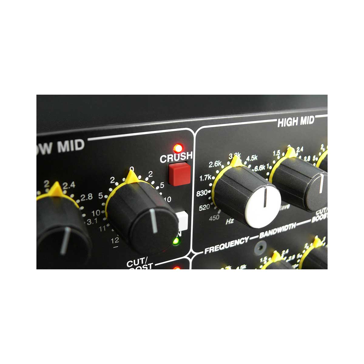 A feature that is unique to the 1971 is the CRUSH button. A switchable option available on each band, it adds a fixed time constant, auto gain makeup compressor, whilst also giving a wider rounder bandwidth. In addition it introduces some musically pleasing harmonics. It'll Fatten your bass, enhance the Presence of your mids, and bring out the Shimmer in the top end.