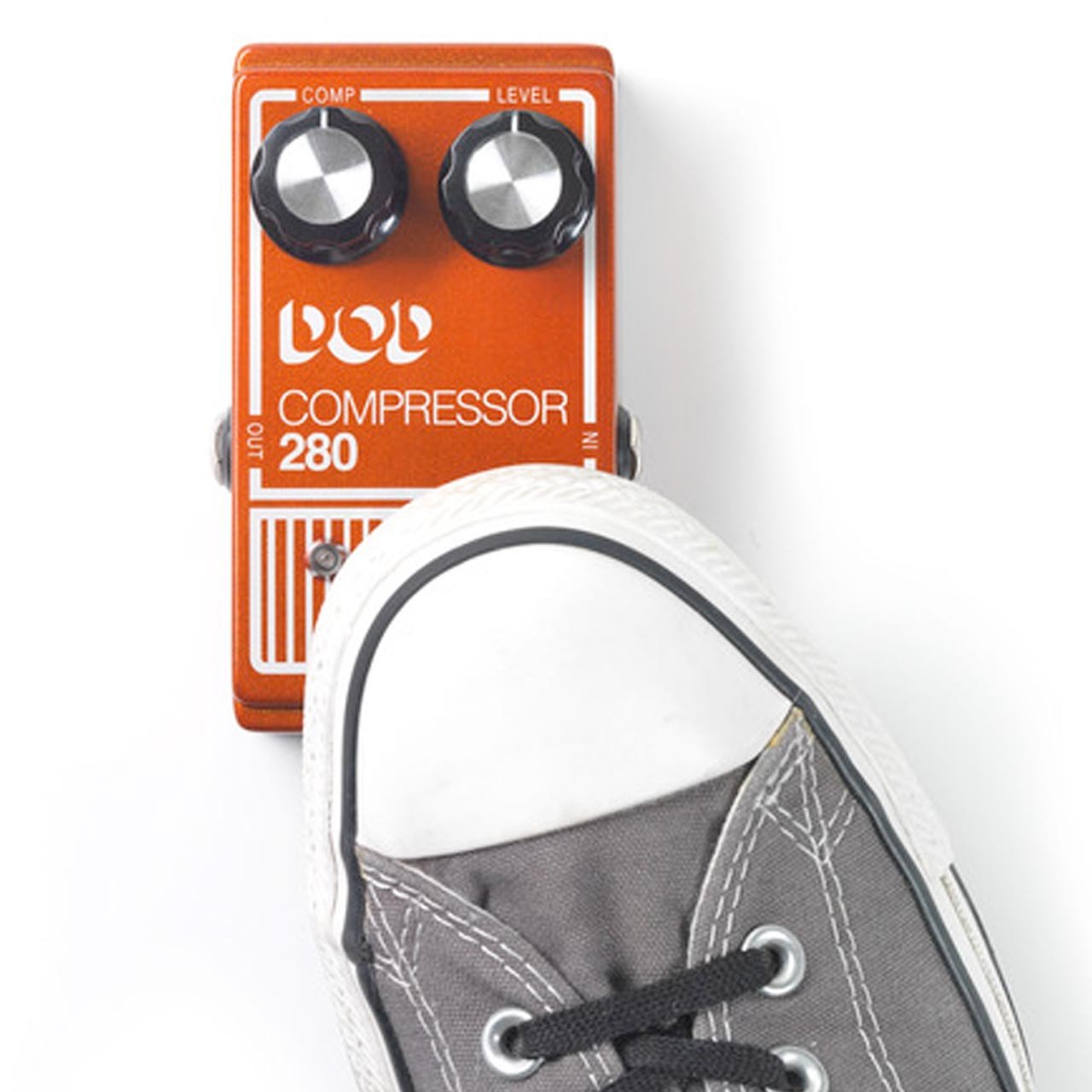 The 280 is an optical compressor that can go from light sustain to utterly smashed with the turn of a knob. Unlike faster non-optical circuits the 280 retains your high frequencies until you get into the more extreme settings. The 280 is ideal for chicken-pickin’, added sustain for leads or snappy-slappy funk rhythm. The 280 also has enough output to be used as a lead boost with added compressor sustain. And like all of the updated DOD pedals, it has a modern power jack, LED, light but strong aluminium chassis, and true bypass switching.
