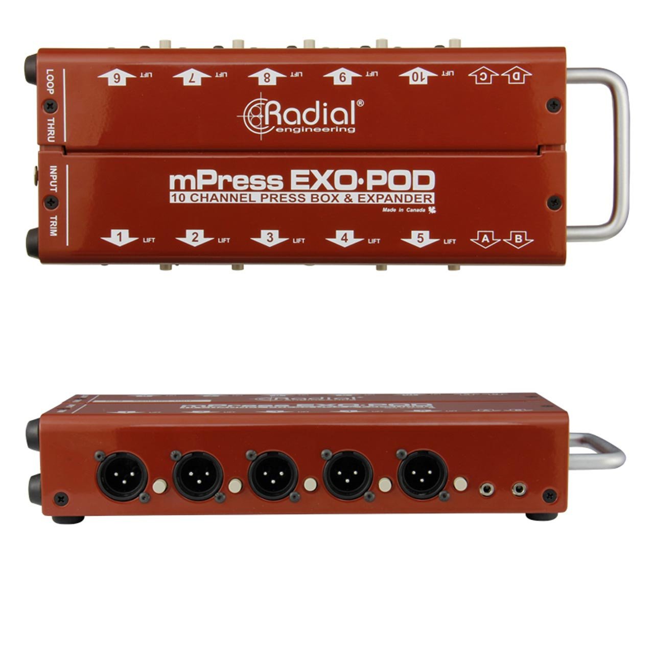The The Radial Exo-Pod Broadcast Splitter allows you to plug into a mixing console, taking the balanced line outs, and then split the signal 14 ways. The Exo-Pod could be used to send audio to portable recorders, cameras and wireless equipment for example. You can also use the The Radial Exo-Pod to create hundreds of feeds as part of a modular system, when used alongside the Radial mPress