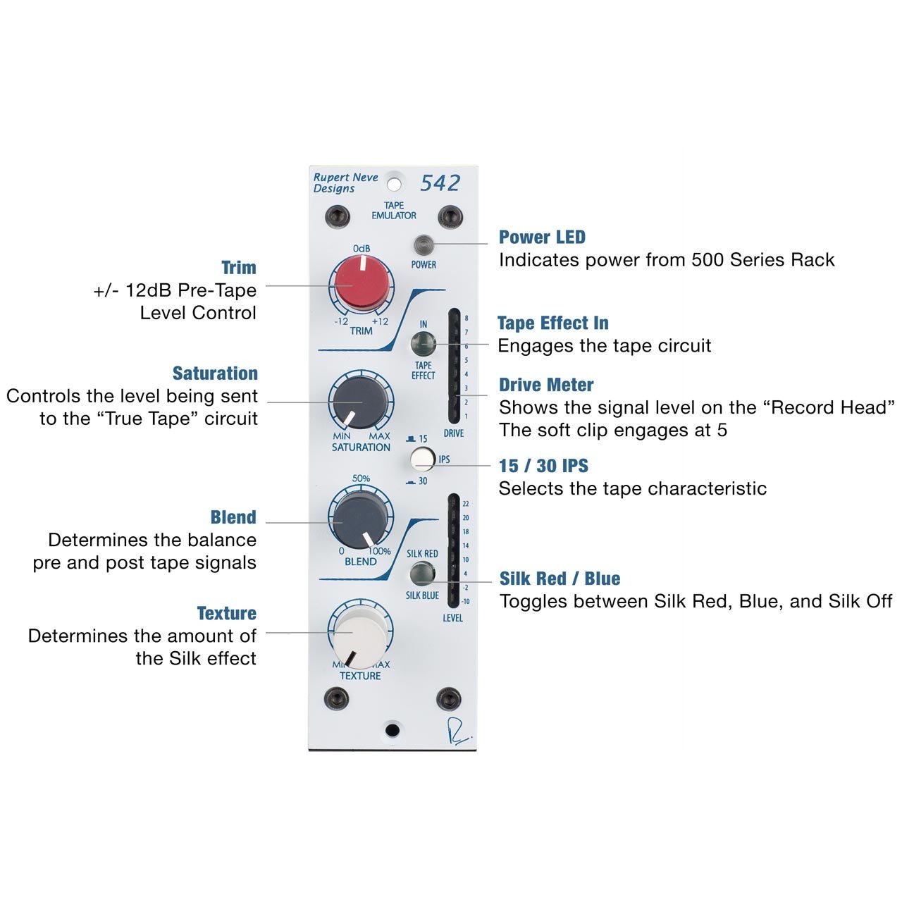 The Rupert Neve Designs 542 is a 500 series module designed to emulate the tonal character of analog tape. The tape circuit found in the 542 is a specially designed transformer that acts as a record head - the more voltage sent into it creates saturation that engages a soft-limit circuit to soften the transients. Described as the “colour box” the 542 highlights 3rd order harmonics, and its soft/clip circuit softens harsh sound sources and enhance 2nd order harmonics.