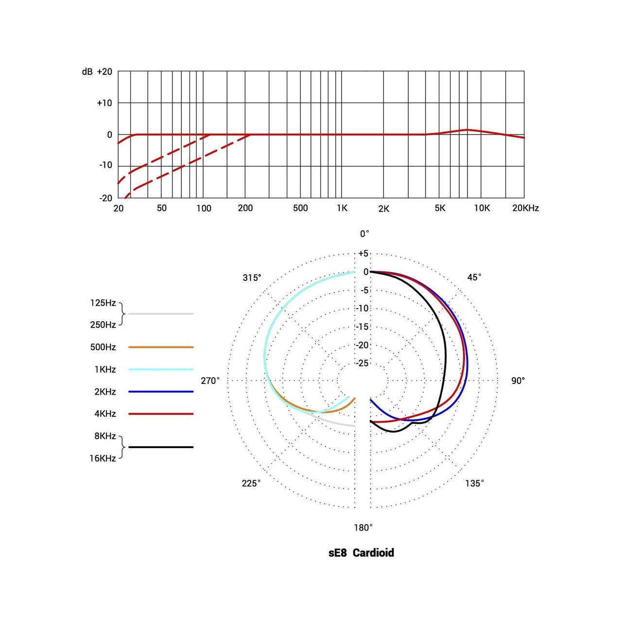The sE8 cardioid condenser pencil microphone is available as factory-matched pair. For more detailed information on the sE8, or to purchase the mic as a single - please click here. The sE8 Matched Pair ships with a stereo bar, metal case, windshields, and mic clips. The sE8 is an exceptional small diaphragm microphone. It features a hand-crafted gold-sputtered capsule, and is cable of handling up to 160dB of SPL! Handy 2-way low-cut filters at 80 and 160Hz and -10 and -20dB pads, make it a versatile solution for a range of instrumental and stereo recording applications.