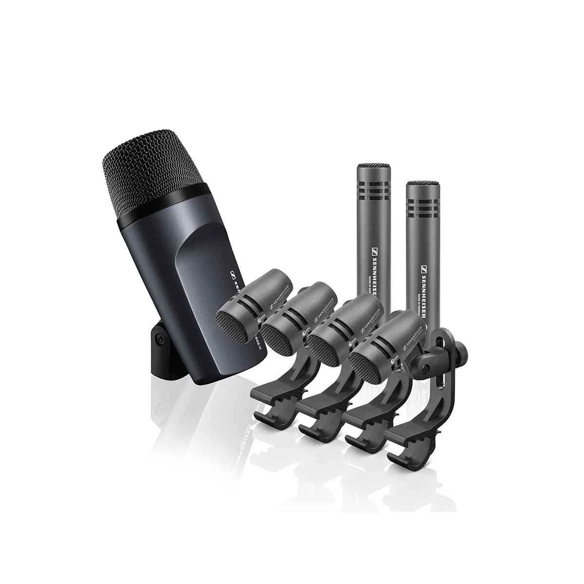 All you need for a powerful drum performance in a heavy duty case for optimal protection. Includes 1x e 602-II, cardioid instrument microphone for bass drums, 4x e 604, cardioid microphone for snare and tom-tom, and 2x e 614, super-cardioid, permanently polarized condenser microphone for cymbal and overhead.