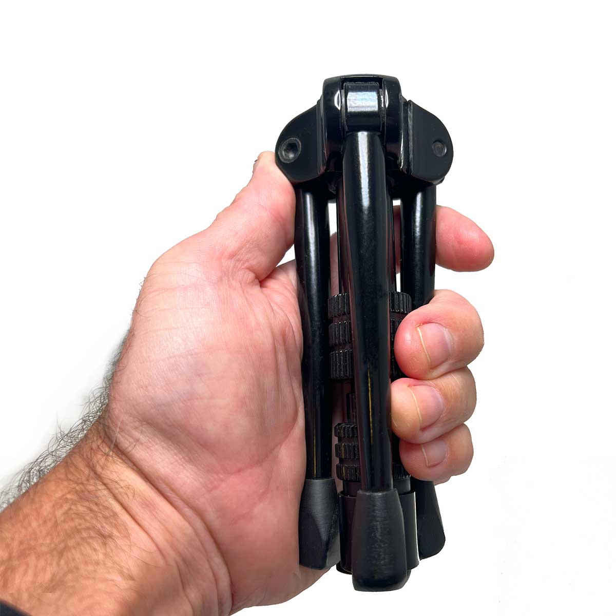 TDS™- Triad Desk Stand small portable desk stand with iO connectivity. TDS has a small footprint (10.25") with a surprisingly low center of gravity, and weighs in at 1.4 lbs. With a max height of 7.9" it is perfect for placing devices on a desk, table, or console. TDS has adjustable legs to allow maneuverability wherever it is placed, and folds upon itself, creating a compact travel companion. Place anything from small monitors to large tablets or heavy large diaphragm condenser mics quickly without concern of tipping. Shown with iOrbit (sold seperately).
